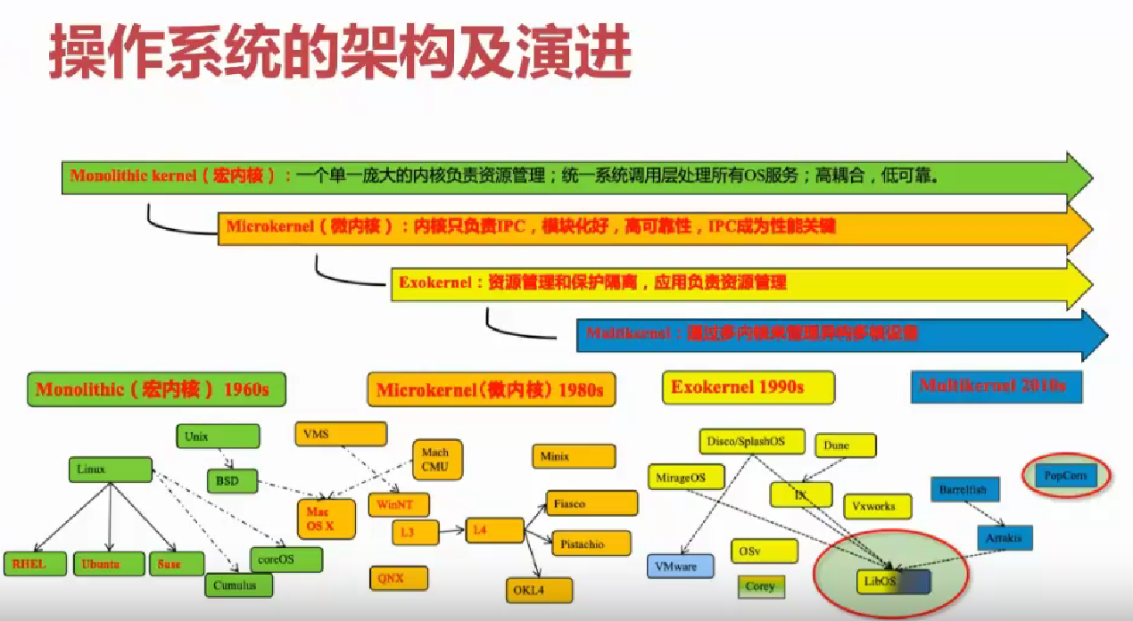 - 第二章:详细讨论了操作系统的结构,包括宏内核、微内核、外核+libOS 以及多内核/复内核等不同的架构模式,并分析了它们各自的优缺点。
