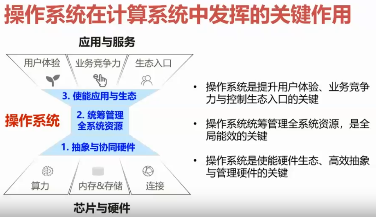 一方面它提供了硬件操作接口和系统调用,来帮助应用程序来访问和利用硬件资源,还负责应用程序的加载和调度,来确保硬件资源的有效利用;